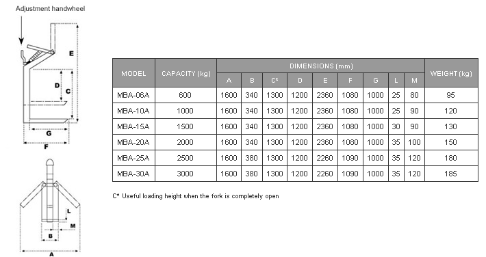 Furca macara paleti Deschidere reglabila in V cu manivela Lungime lame 1000 mm , lame cu autonivelare Reglare automata a centrului de greutate cu arc |